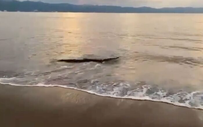 Un cocodrilo salió del agua en la playa Bocanegra en Puerto Vallarta, Jalisco, y estuvo cerca de atacar a un joven que se encontraba nadando en el mar.