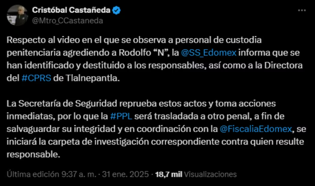 El secretario de Seguridad mexiquense indicó que: “Respecto al video en el que se observa a personal de custodia penitenciaria agrediendo a Rodolfo “N”, la @SS_Edomex informa que se han identificado y destituido a los responsables, así como a la Directora del #CPRS de Tlalnepantla”.